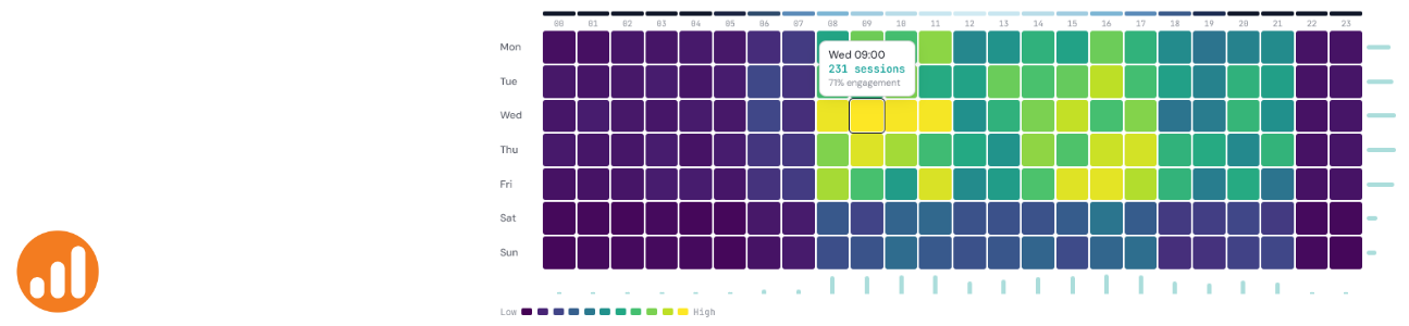 Identify peak traffic windows and high-engagement slots in your GA4 data with an interactive day-of-week and hour-of-day heatmap.