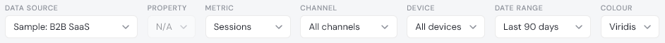Device filters to Desktop, Mobile, or Tablet. Mobile traffic frequently peaks at different times to desktop, and if you are optimising for a specific device type, seeing the pattern in isolation is more useful than the blended view.