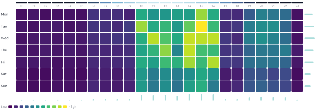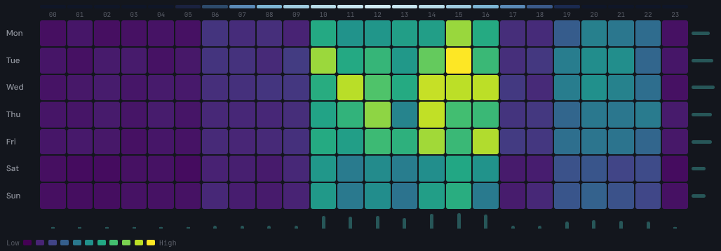 The format answers a question that flat reports and line charts handle poorly: not just when traffic is high, but which specific day-and-hour combinations consistently perform differently from the rest. A Tuesday at 09:00 might look similar to a Tuesday at 16:00 in aggregate weekly data, but the grid makes any difference immediately visible.