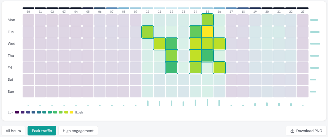 Peak traffic highlights the cells with the highest volume values and dims everything else. This is useful when you want a clear answer to the question of when your audience is simply most active, without the rest of the grid distracting from the pattern.