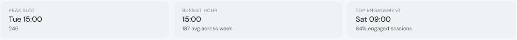 High engagement highlights cells where the GA4 engagement rate is high. A slot with high sessions and high engagement is a strong candidate for scheduled content or ad delivery. Slots with high sessions but low engagement can signal that the audience arriving at that time is less qualified or less interested.